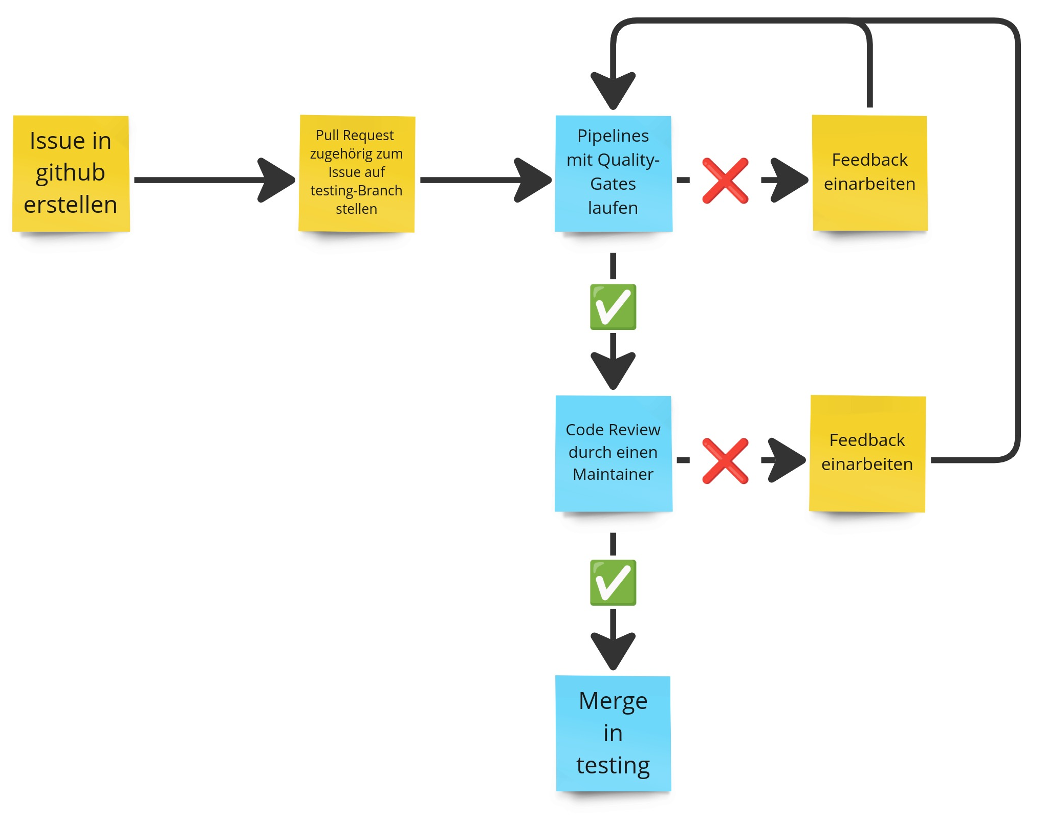 Nach dem erfolgreichen Durchlauf der Pipelines erfolgt ein manueller Review-Prozess durch Maintainer des Projekts und ggf. Feedback zum Pull-Request. Am Ende erfolgt die Integration in das Projekt.